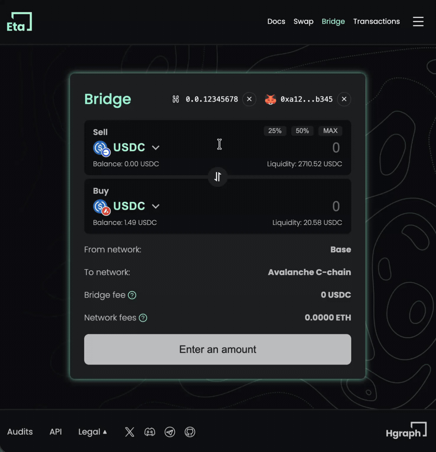 - Enter the amount of USDC you want to bridge. The interface will display the estimated amount you'll receive on the destination chain after fees.